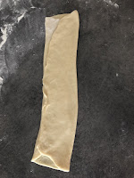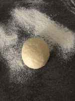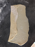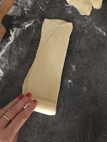 Z każdej porcji ciasta uformować okrągłą bułeczkę. Następnie posypując mąką rozwałkować na prostokąt o grubości 1-2mm. Boki prostokąta zawinąć do środka, trochę rozwałkować i zawinąć w bułeczkę (patrz zdjęcie)