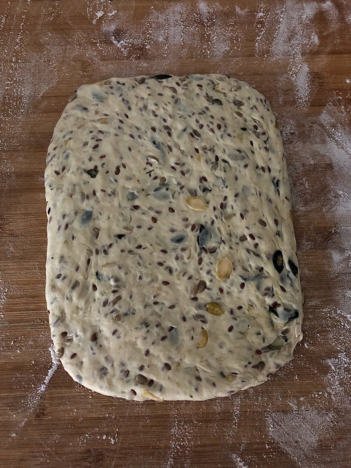 Obie mąki odmierzyć, dodać sól, maślankę, namoczone ziarna, mieszaninę wody, drożdży i cukru oraz miękkie masło. Wyrobić ciasto, najlepiej za pomocą roota kuchennego ale ręcznie też pójdzie do zrobić.