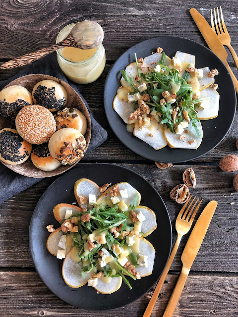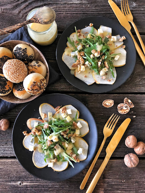 Ostatnio polubiłam carpaccio i chętnie robię je w wersji wegetariańskiej. Dziś carpaccio z gruszki z sosem miodowo- musztardowym, serem z niebieską pleśnią i prażonymi orzechami. To połączenie pasuje do siebie idealnie a smaki rewelacyjnie się uzupełniają.