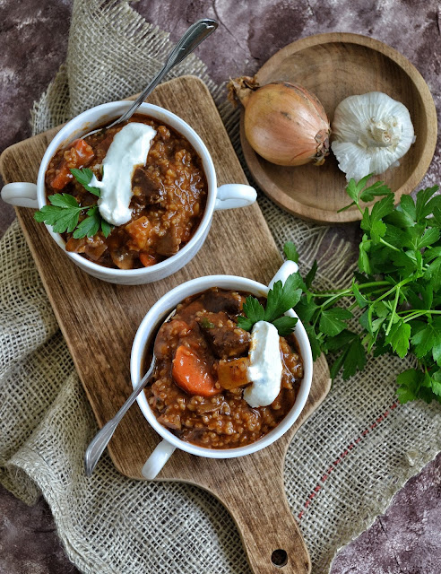Ta potrawa to rodzaj dania jednogarnkowego. Mięso, kasza i warzywa w jednym. Jest bardzo sycące bo jedna porcja wystarczy żeby zapełnić żołądek na full. Inspiracja pochodzi z bloga Magazyn Kuchenny, ale Ja dodałam parę zmian.