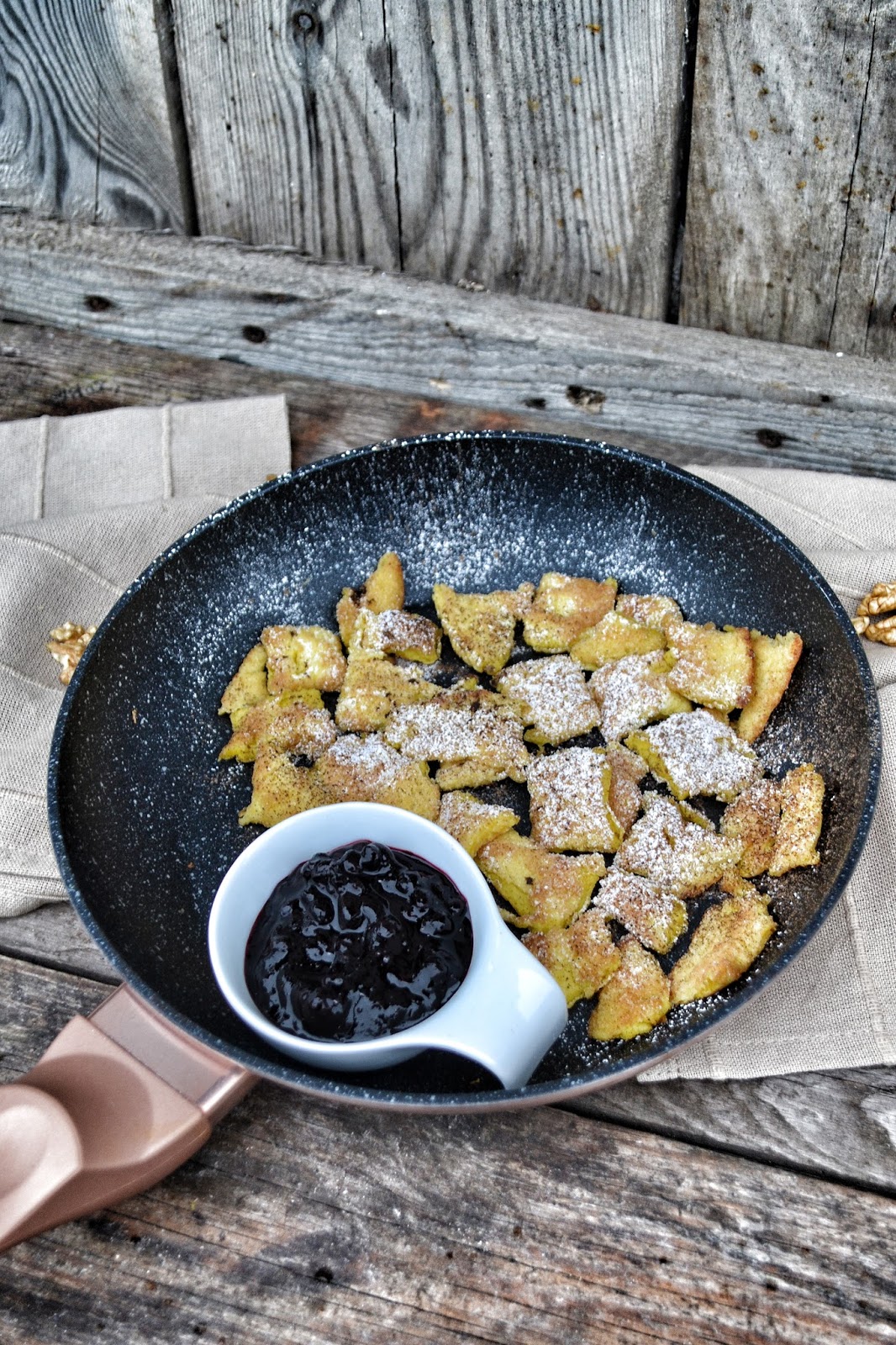Moja rodzina uwielbia śniadania na słodko. Ale nie zawsze jesteśmy w pełnym składzie i takie cesarskie śniadania jadamy. Omlet cesarski, bo takie jest tłumaczenie Kaiserschamrrn to bardzo puszysty placek, który zjada się zazwyczaj z powidłami śliwkowymi. U nas podajemy z konfiturą jagodową. Przepis zaczerpięty z bloga: http://whiteplate.com/