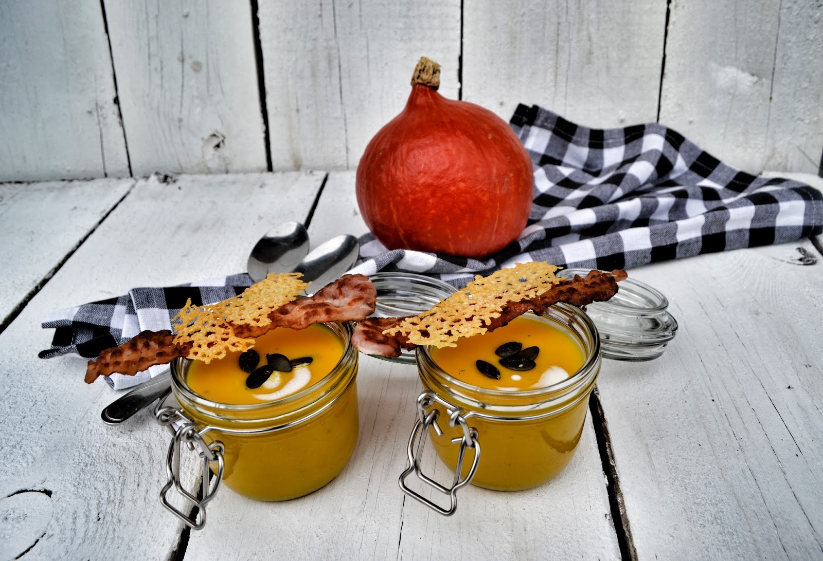 Czekałam na tę porę roku, dla tej dyni. Uwielbiam tę aksamitną i delikatnie pikantną w smaku zupę. Dla chrupkości dodałam dwa chipsy z bekonu i cheddara.