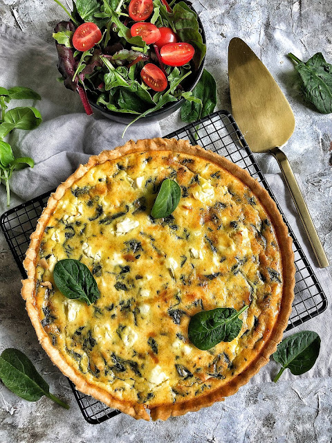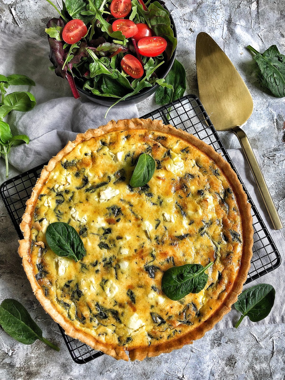 Krucha tarta ze szpinakiem, fetą i cheddarem