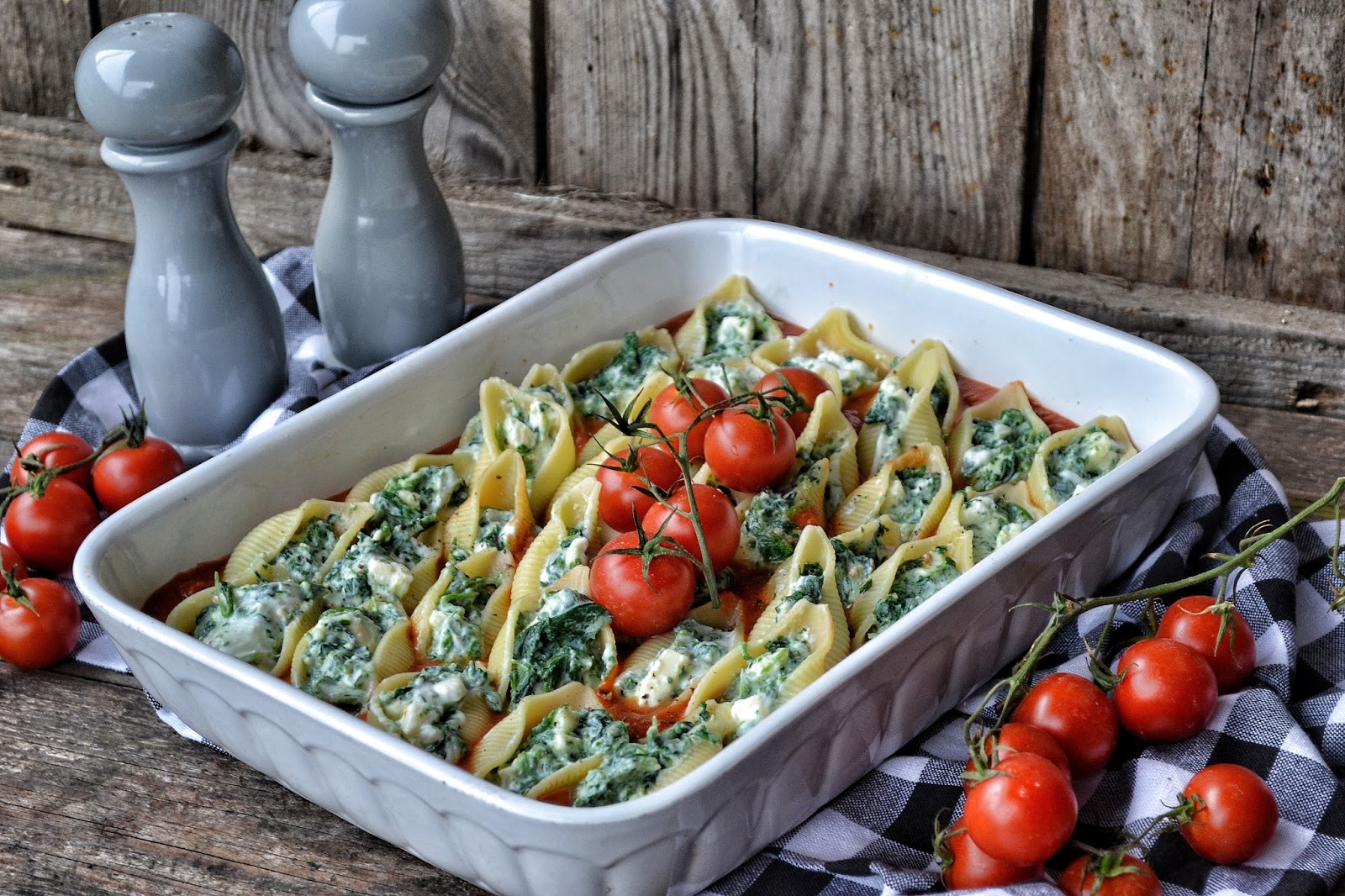 Tak przygotowany sos wlej do żaroodpornego naczynia. Muszle makaronowe nadziać farszem z szpinaku i ricotty.