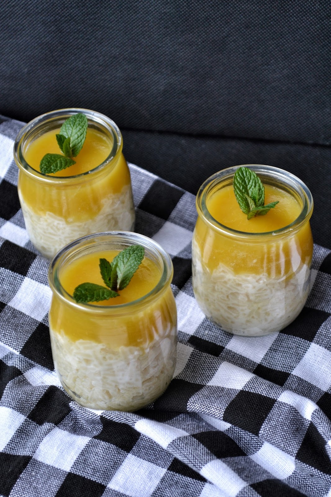 Nakładamy porcje na talerze, dodajemy mus z mango i listkiem mięty.