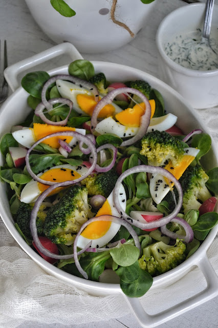 Na półmisku układamy sałatę i roszpunkę, na niej pokrojone rzodkiewki, brokuły, jajka. Cebulę kroimy w cienkie krązki i również układamy na wierzchu. Całość posypujemy czarnuszką.