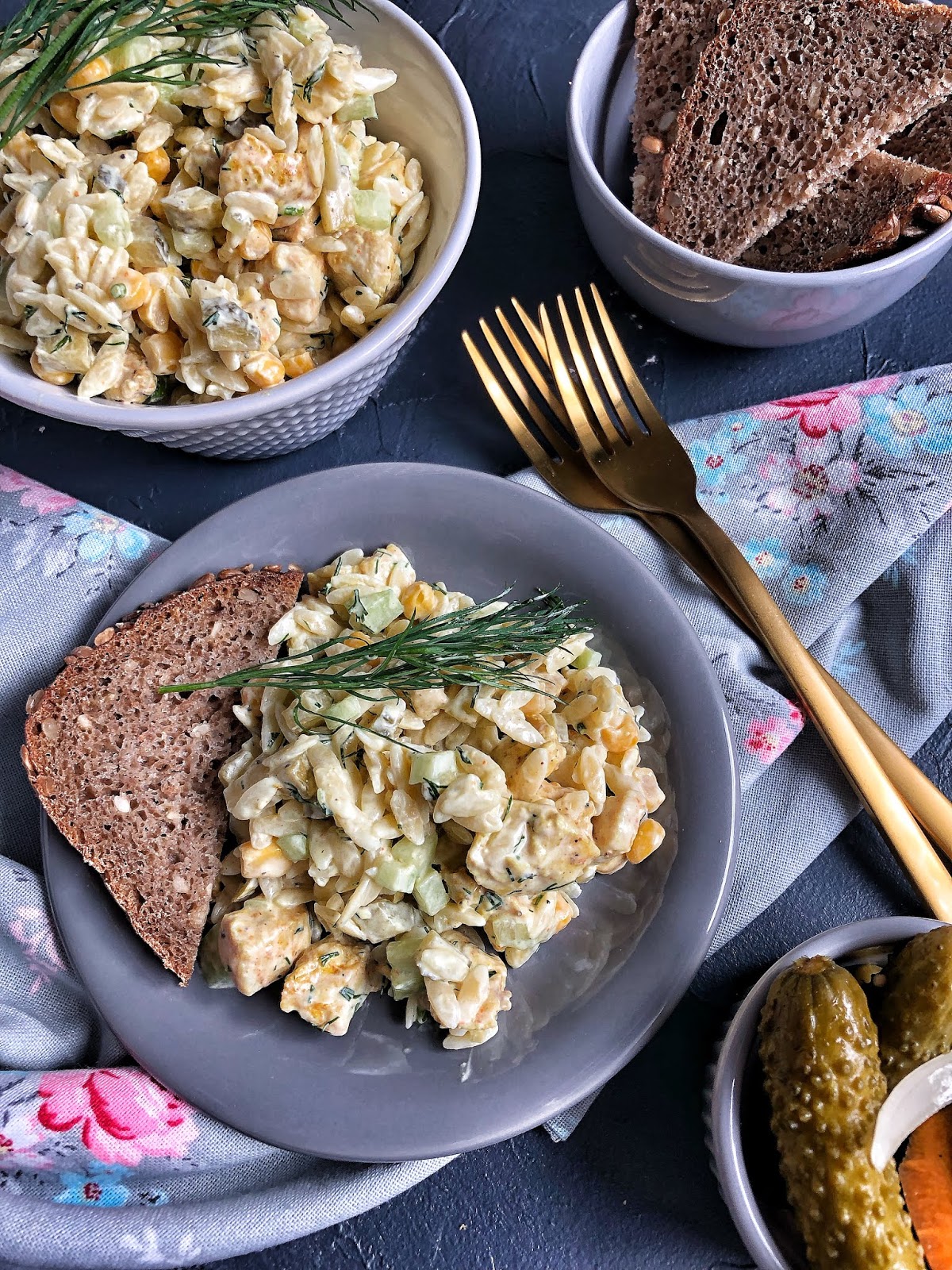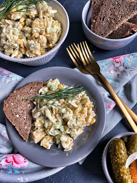 Ta sałatka pojawia się na Naszym stole często bo cała rodzinka się nią zajada. Makaron ryżowy, inaczej Orzo to makaron w kształcie ryżu. Idealnie pasuje do sałatek. Kurczak przyprawiony przyprawą z dodatkiem kurkumy i curry. Całość jest naprawdę przepyszna.