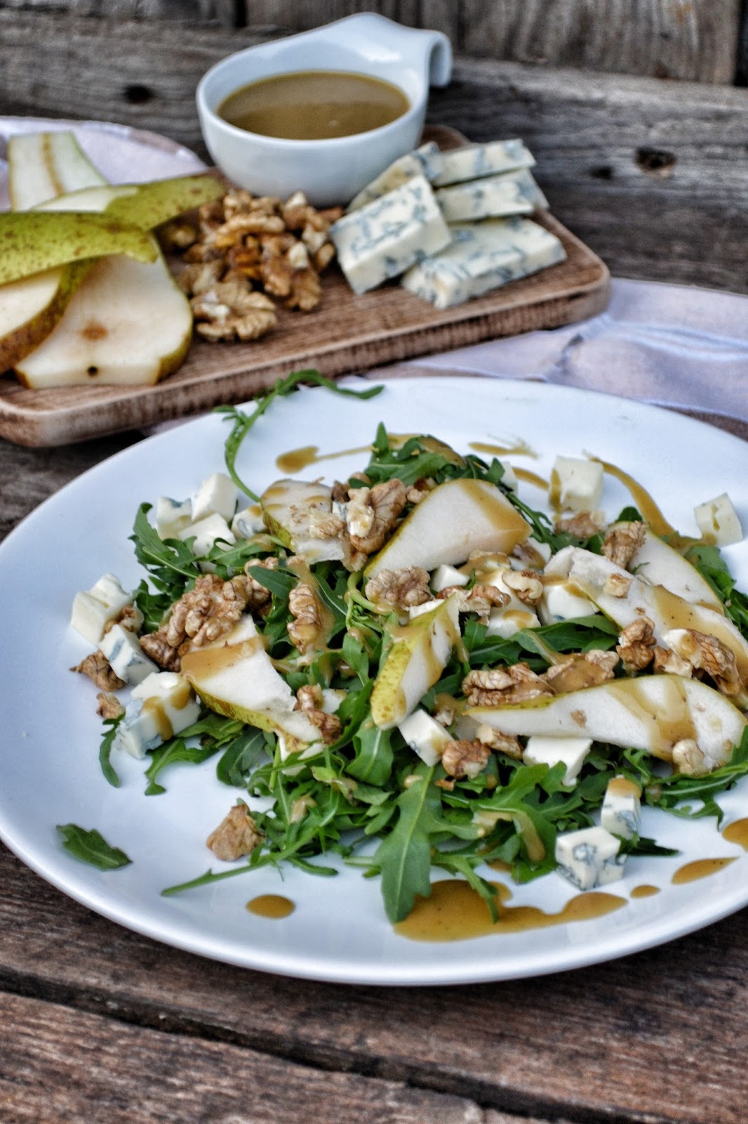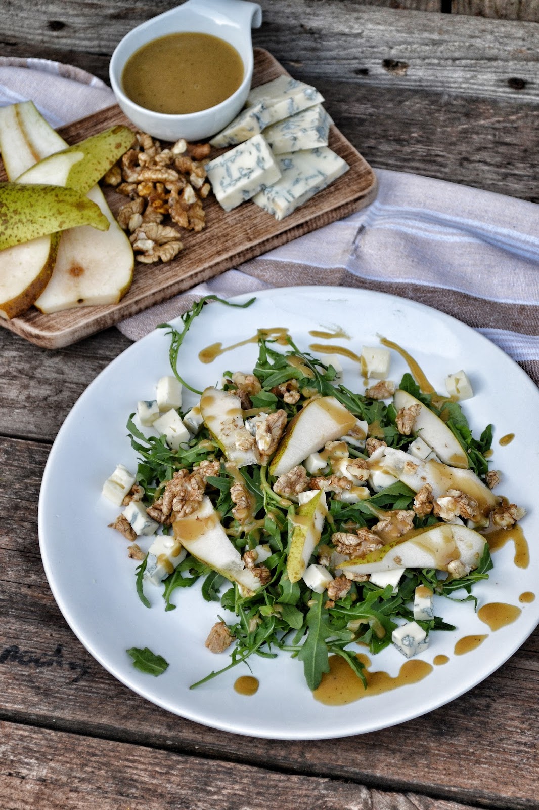 Sałatka z rukolą, serem blue, gruszką i sosem miodowo-musztardowym