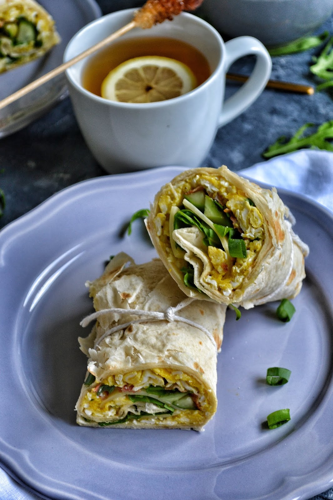 Jajecznica, bekon, ogórek małosolny i ser ementaler zawinięte w płat tortilli. Idealnie rozpoczęty dzień.