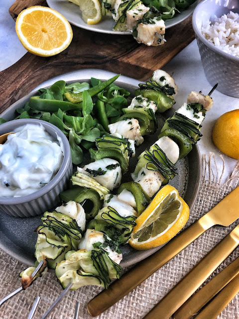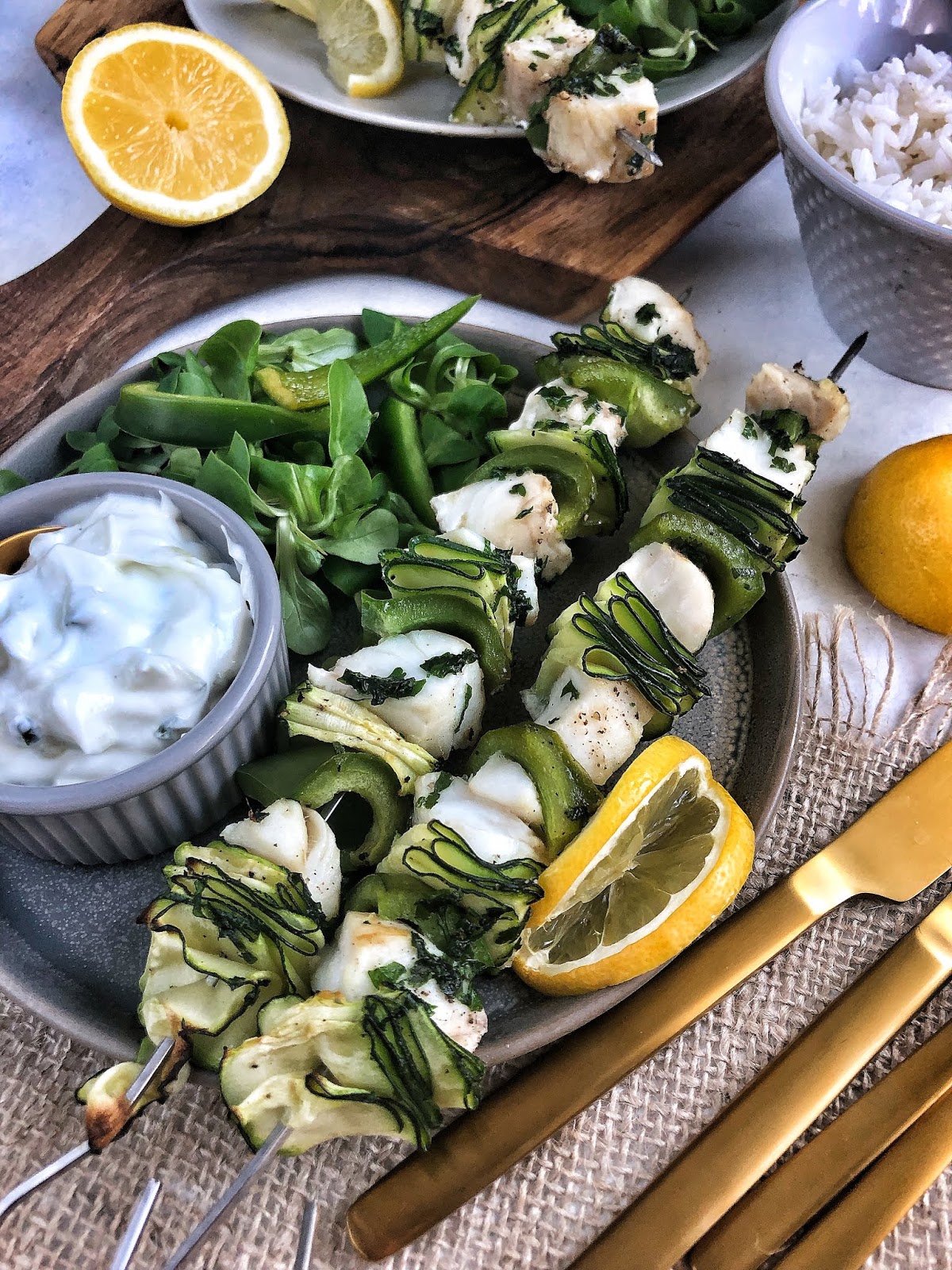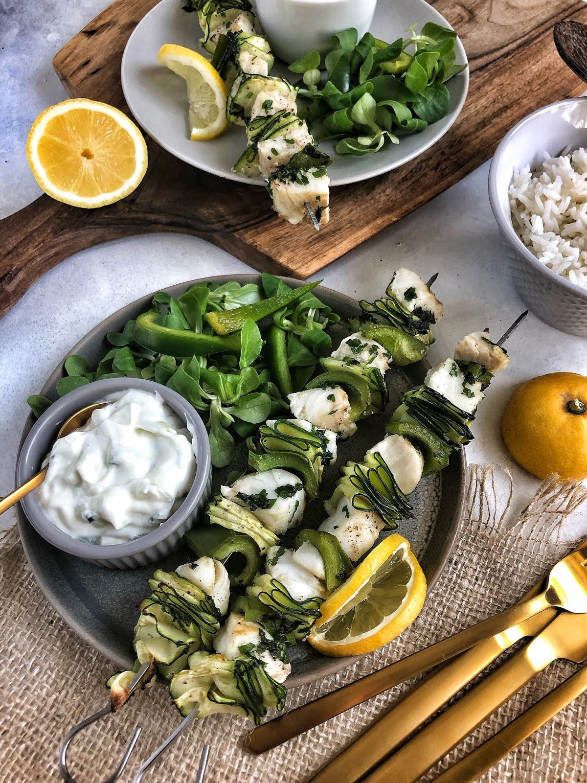 Lekkie, zdrowe dani z ryby. Szaszłyki z dorsza idealnie sprawdzą się na grilla czy na obiad upieczone w piekarniku. Posmarowane masłem pietruszkowym są bardzo aromatyczne. Dodatkiem jest sos tzatziki.