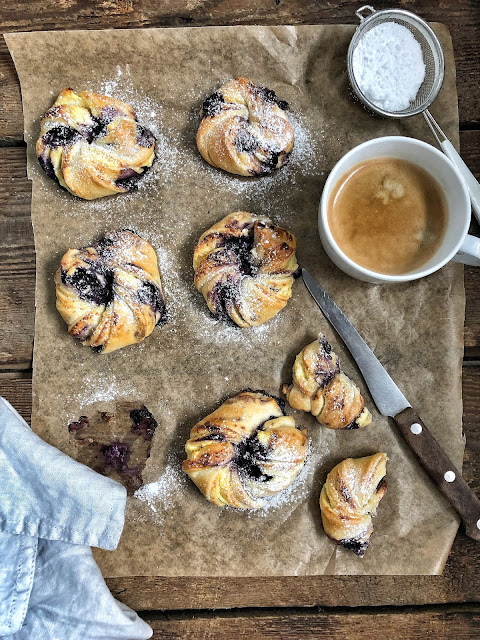 Mam pół zamrażalnika jagód więc muszę je powoli zacząć zużywać przed świeżą dostawą. Te wianuszki są rewelacyjne bo z twarożkiem i jagodami.