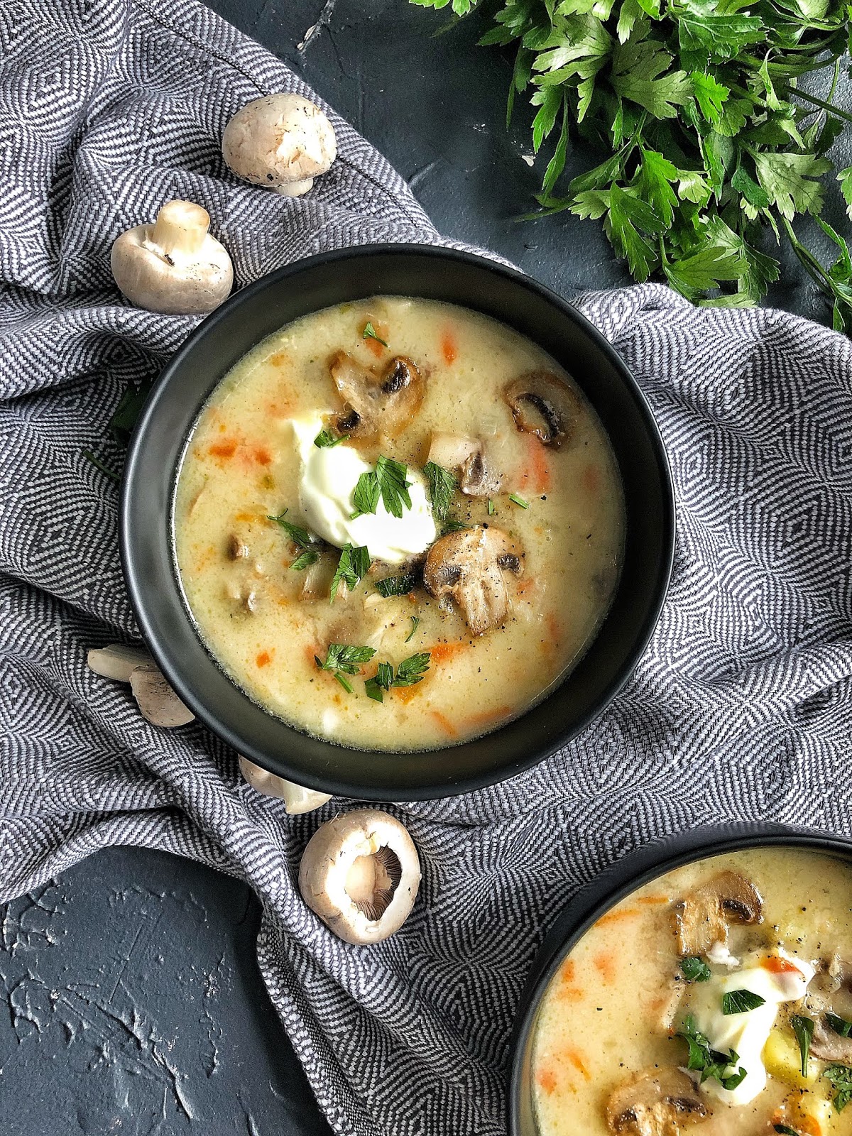 Przykryć i gotować na średnim ogniu ok 30 min aż pieczarki będą miękkie. Następnie dodać kostki ziemniaków i gotować kolejne 10 min. Mąkę dobrze rozmieszać w śmietance i wlać do zupy najpierw połowę i obserwować konsystencję. Jeśli zupa jest już delikatnie zaciągnięta więcej nie dolewać. Ale jeśli chcemy zupę bardziej białą dodać więcej śmietanki. Zagotować i zakręcić. Doprawić jeszcze solą i pieprzem. Posypać świeżo posiekaną natką pietruszki i kleksem śmietany.