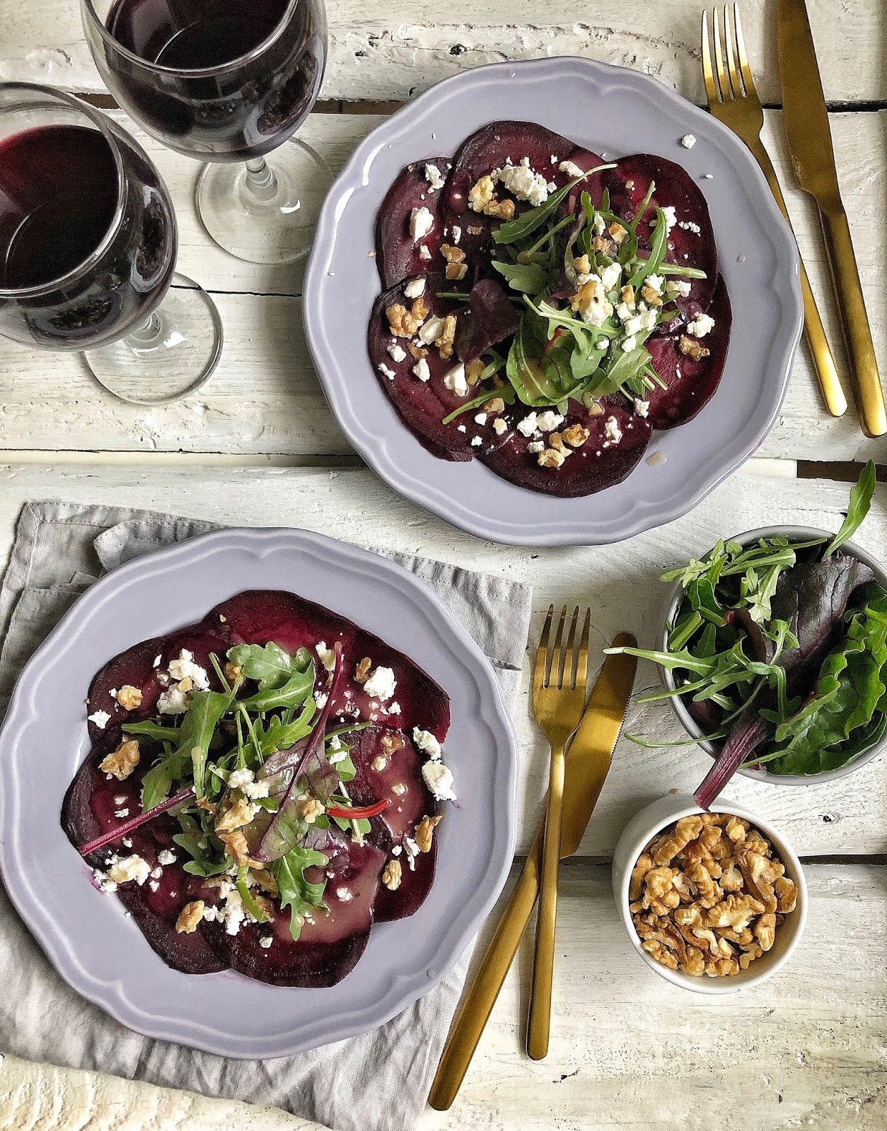 Carpaccio wyszło przepyszne, odczarowuje buraki, które nie należą do moich ulubionych warzyw. Podałam z dodatkiem liści szpinaku, bo tylko je miałam. Dodatkowo oprócz orzechów włoskich, podprażyłam migdały siekane i słonecznik. Zarówno mnie jak i mężowi, bardzo smakowało.