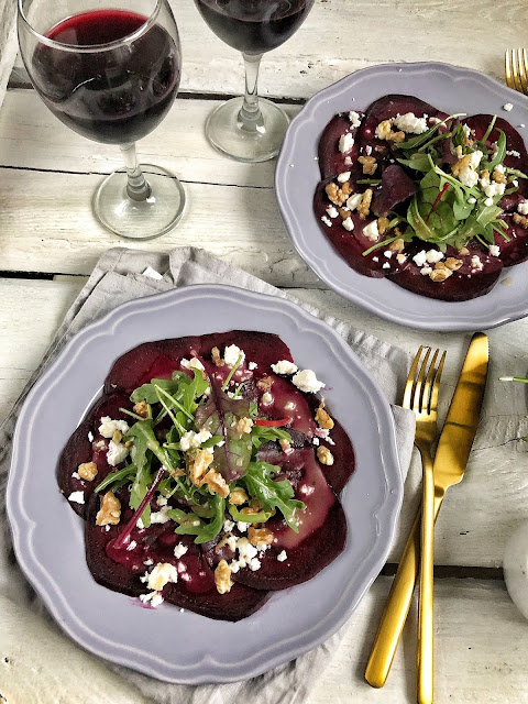 Carpaccio z pieczonego buraka to świetny pomysł na przystawkę lub lekką kolację. Bardzo lubię połączenie słodkiego buraka, słonej fety i sosu słodko- kwaśnego. Całość posypana prażonymi orzechami włoskimi co dla mnie było nowością. Idealne połączenie.