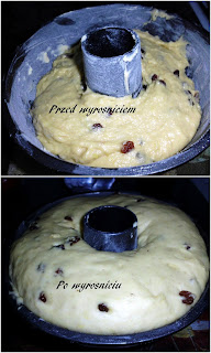 Po tym czasie ciasto wyjąc, wyrobić raz jeszcze. Formy do babek natłuścić i wysypać kaszą manną lub mąką krupczatką. Ciasta nałożyć do 1/3 wysokości formy (u mnie wyszły dwie babki: jedna jak na zdjęciu, druga mniejsza). Przykryć znowu, odłożyć w ciepłe miejsce do podwojenia objętości (ciasto powinno wyrosnąć po brzegi foremek).