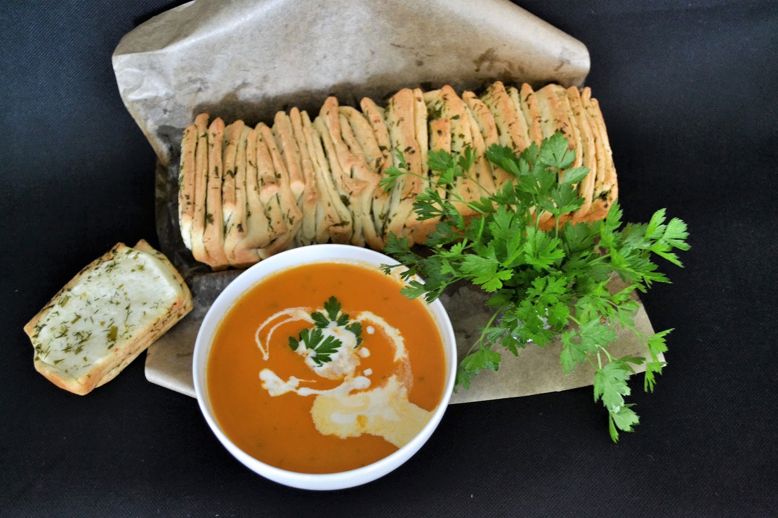 Zupa ze świeżych pomidorów malinowych z odrywanym chlebkiem ziołowym